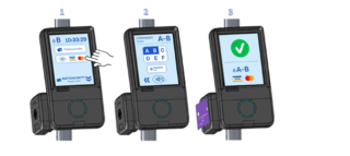 - Ställ betalkortet i kodavläsaren på fjärravläsarens vänstra sida. Om betalningen lyckas, meddelar kodavläsaren resezonerna och på rutan syns OK.