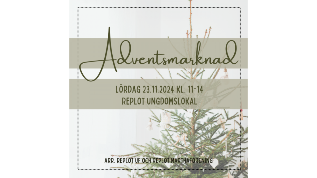 Kom i julstämning tillsammans med oss i Replot! Årets adventsmarknad i Replot UF går av stapeln lördagen den 23.11.2024, kl. 11-14 i Replot ungdomslokal (Byhamnvägen 94). Replot UF ordnar servering med risgrynsgröt, laxsmörgåsar, jultårtor, kaffe och glögg. Replot marthaförening ordnar snabblotteri. Många härliga produkter finns till försäljning av flera olika försäljare och lokala föreningar, bl.a. bakverk, leksaker, barnkläder, julkransar, kärvar, tomtar och hantverk. Hoppets stjärna är på plats vid ungdomslokalen kl. 12-14 och tar emot donationer. Hjärtligt välkomna!