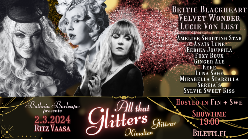 Den legendariska Ritz fylls av glitter och utmärkt scenkonst när Bothnia Burlesque anländer till Vasa med sitt glitterlast! Ni kan uppleva en hisnande kollektion av scenkonst, som kommer att smälta snön och får sätena i Ritz att skälva! Attraktionen för detta fantastiska evenemang är den finska burlesklegenden, the one and only Bettie Blackheart! Bland burlesk kommer ni även bli förtjusta av drag, pole twerk och cirkus.