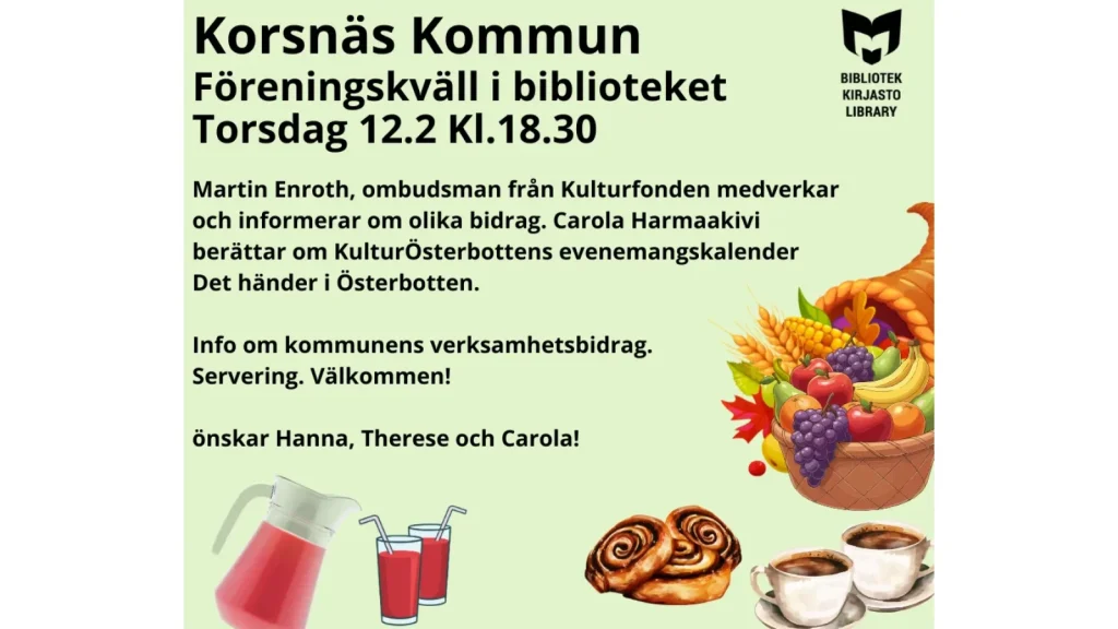 Vi börjar med kaffe kl 18.30 och lyssnar på KulturÖsterbottens informationssekreterare som instruerar i användningen av Den händer i Österbotten-evenemangskalendern. Kulturombudsman Martin Enroth berättar om Kulturfondens bidrag och ger tips om goda ansökningar. Kommunens tjänstemän berättar om de verksamhets- och driftsbidrag som kan sökas av föreningar i Korsnäs under våren. Diskussion.