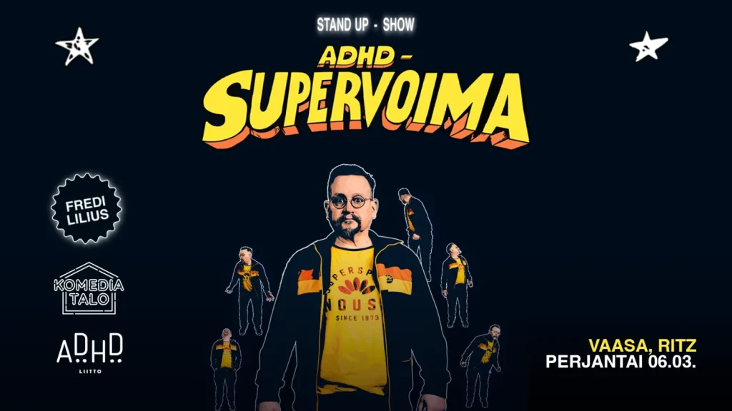 Fredi Lilius on 52-vuotias stand up koomikko Tampereelta. Kiertueen aiheena ADHD supervoimana