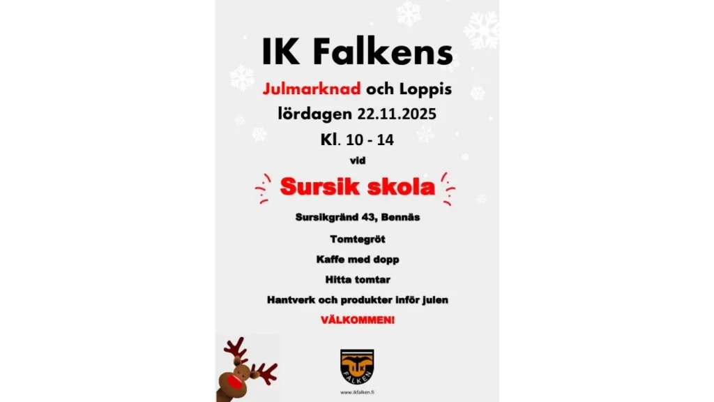 IK Falkens Julmarknad & Loppis lördag 22.11.2025 kl.10-14 vid Sursik skola i Pedersöre.