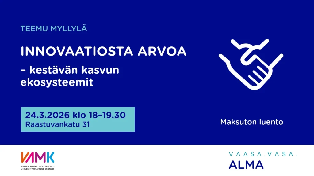 – 24.3.2026 klo 18–19.30. Innovaatiosta arvoa – kestävän kasvun ekosysteemit. Lehtori Teemu Myllylä, VAMK.