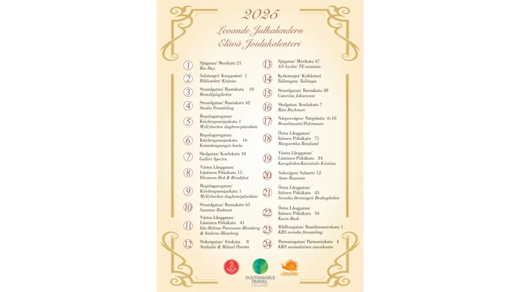 Ett dekorerat fönster eller lucka öppnas varje dag från den 1.12. - 24.12. i Kristinestad.