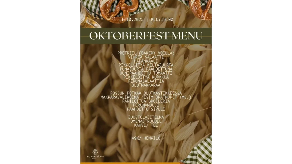 Hunurijärvi Resort arrangerar igen en traditionell Oktoberfest med tyska delikatesser i både mat- och dryckesväg. Planera in lördag 11 oktober för en avslappnad kväll med härlig stämning och livemusik av Philip Järvenpää & The Butlers.