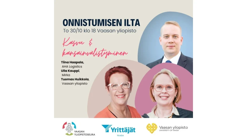 Vaasan yliopistoseura, Vaasan Yrittäjät ja Vaasan yliopisto järjestävät jo kahdeksatta kertaa Onnistumisen illan. Kyseessä on vuosittainen tapahtuma, jossa jokainen voi oppia ja innostua yrityksen tai yrittäjän menestystarinasta eri teemojen kautta. Tällä kertaa illan läpileikkaavana teemana on Kasvu & kansainvälistyminen.