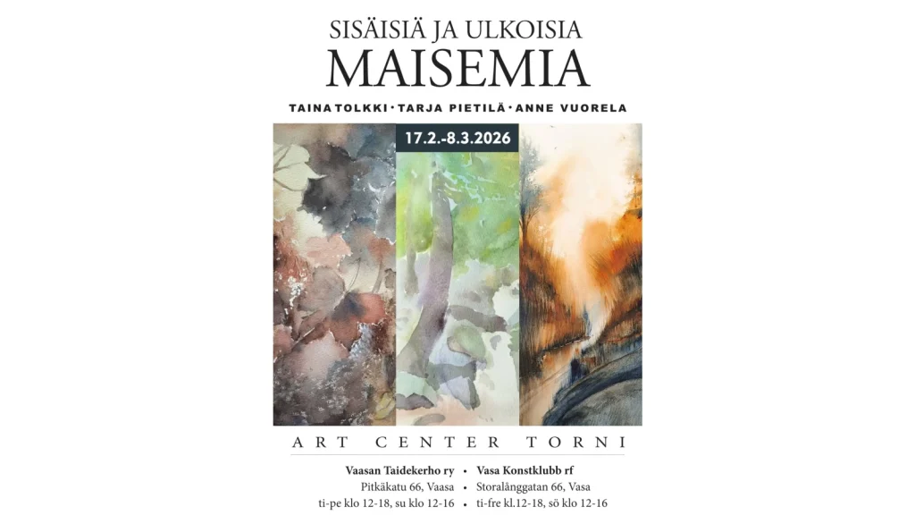 Art Center Torni. Pitkäkatu 66, Vaasa. Taina Tolkki, Tarja Pietilä & Anne Vuorela: Sisäisiä ja ulkoisia maisemia 17.2.-8.3.. Avoinna ti-pe 12-18, su 12-16 (taiteilija paikalla). Vapaa pääsy.