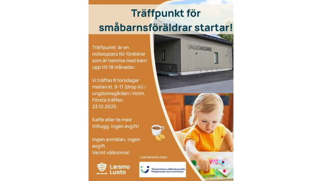 Träffarna riktar sig till föräldrar med barn under 18 månader och kommer att hållas varje torsdag mellan den 23 oktober och 11 december – totalt åtta tillfällen. Dörrarna är öppna kl. 9–11, och det bjuds på kaffe/te och något litet tilltugg. Deltagandet och serveringen är kostnadsfria.