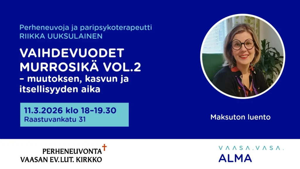 Kaikille avoin ja maksuton Vaihdevuodet murrosikä vol. 2 – muutoksen, kasvun ja itsellisyyden aika -luento pidetään Vaasan kansalaisopisto Almassa keskiviikkona 11.3.2026 klo 18–19.30, Raastuvankatu 31, juhlasali A318, 3. kerros. Luento pidetään suomen kielellä.