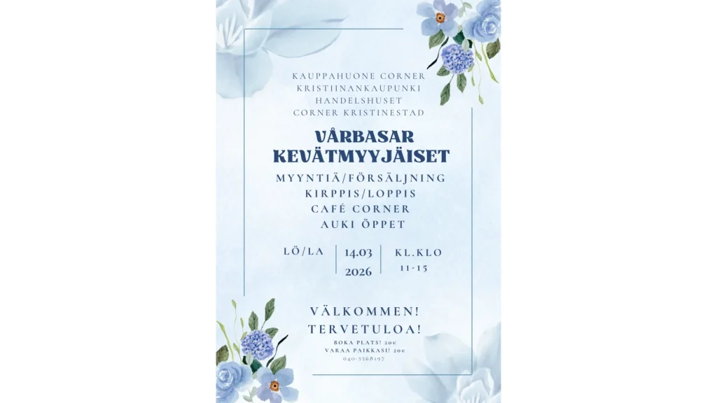 Vårbasar i handelshuset Corner med många försäljare. Cafe' Corner öppet. Boka din plats som försäljare.