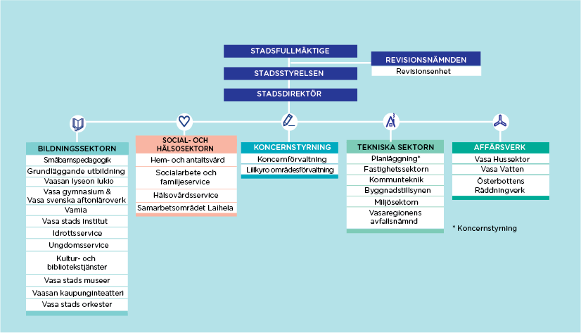 Vasa stads revisionsnämnds position och stadens tjänsteproducerande organisation i början av år 2021 presenteras i schemat nedan: