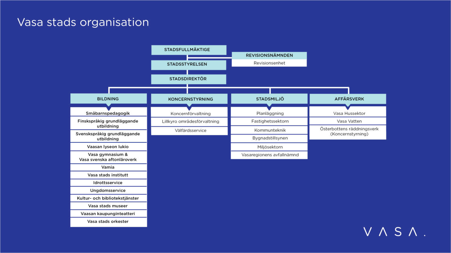 Sedan början av år 2021 har en del förändringar skett i Vasa stads organisation. Till exempel ändrades tekniska sektorn i början av augusti till stadsmiljösektorn. Samtidigt ändrades delar av organisationen för de förtroendevalda. Vasa stads social- och hälsovårdssektor överfördes i början av år 2022 till Österbottens välfärdsområde. Organisationen som är i kraft från början av år 2022 finns i bilden nedan: