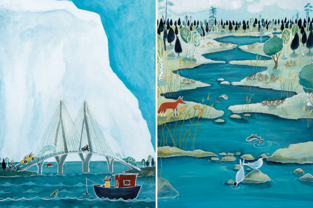 För år 2023 skapades en serie vykort som berättar om världsarvet genom barnens husets konstnären Sanna Eks ögon. De två illustrationerna i serien leker med Barnens husets illustrationer så att alla kan ta med sig en liten bit av husets konst hem. En av illustrationerna är ett roligt sätt att illustrera bakgrundshistorien till vårt världsarv, istiden, i jämförelse med Finlands längsta bro, Replotbron (vid tidpunkten för projektet). Den sista illustrationen testar hur Kvarkens skärgård skulle se ut som en egen ”Mumindal”. Korten kommer att finnas till försäljning i Världsarvsporten under sommaren 2023. Klicka för att förstora bilderna.