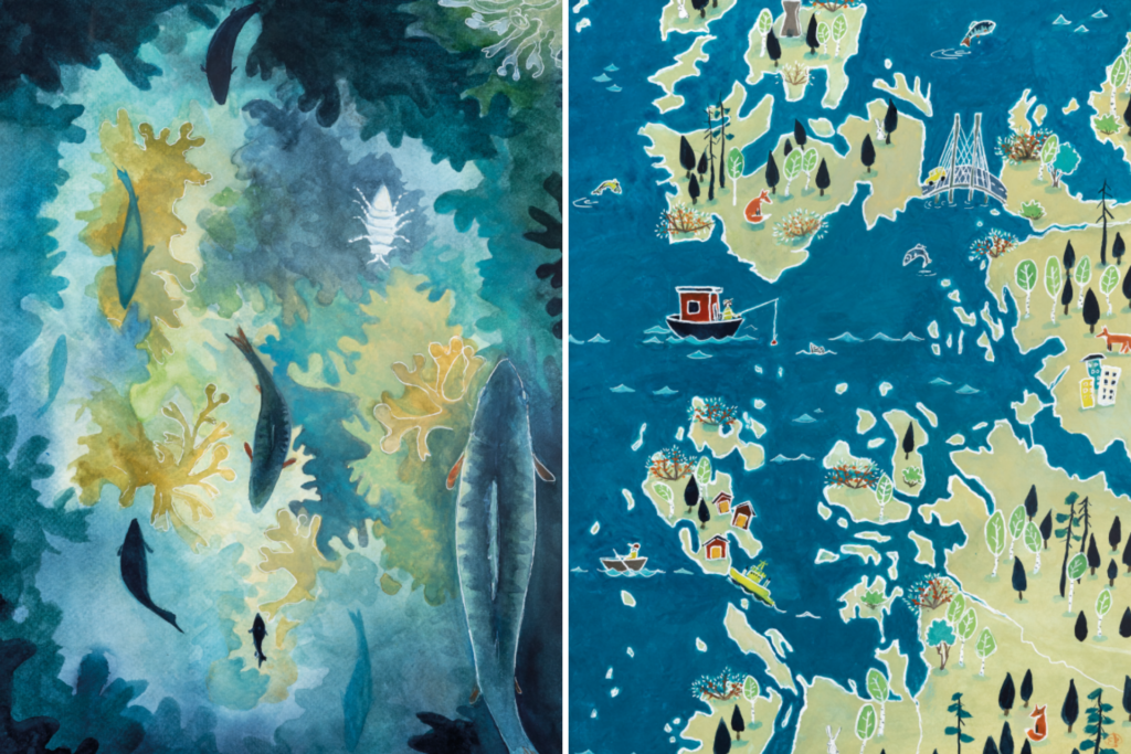 I samarbete med Studio Strandman skapades en ny visuell värld för världsarvets Kvarkens skärgårds i form av vykort. Illustrationerna utformades för att lyfta fram hur världsarvet kan upplevas året runt. Utifrån havtornsillustrationen tillverkades också en inhemsk plywoodbricka. Till salu i besökscentret Världsarvsporten. Klicka på bilderna för att förstora dem.