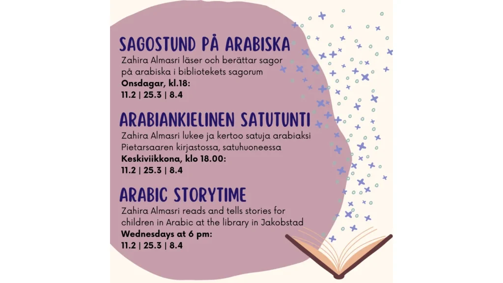 Zahira Almasri lukee ja kertoo satuja arabiaksi Pietarsaaren kirjastossa, satuhuoneessa.