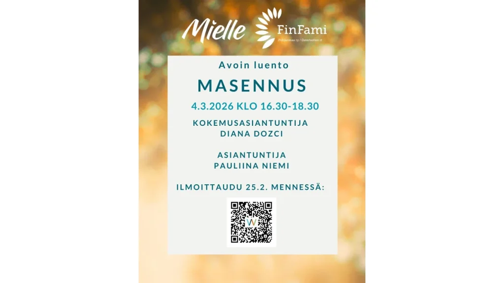 Luento sopii kaikille, jotka haluavat ymmärtää masennusta paremmin, olitpa huolissasi itsestäsi tai läheisestäsi. Luennolla kuullaan kokemusasiantuntija Diana Dozcin ja asiantuntija Pauliina Niemen puheenvuorot.