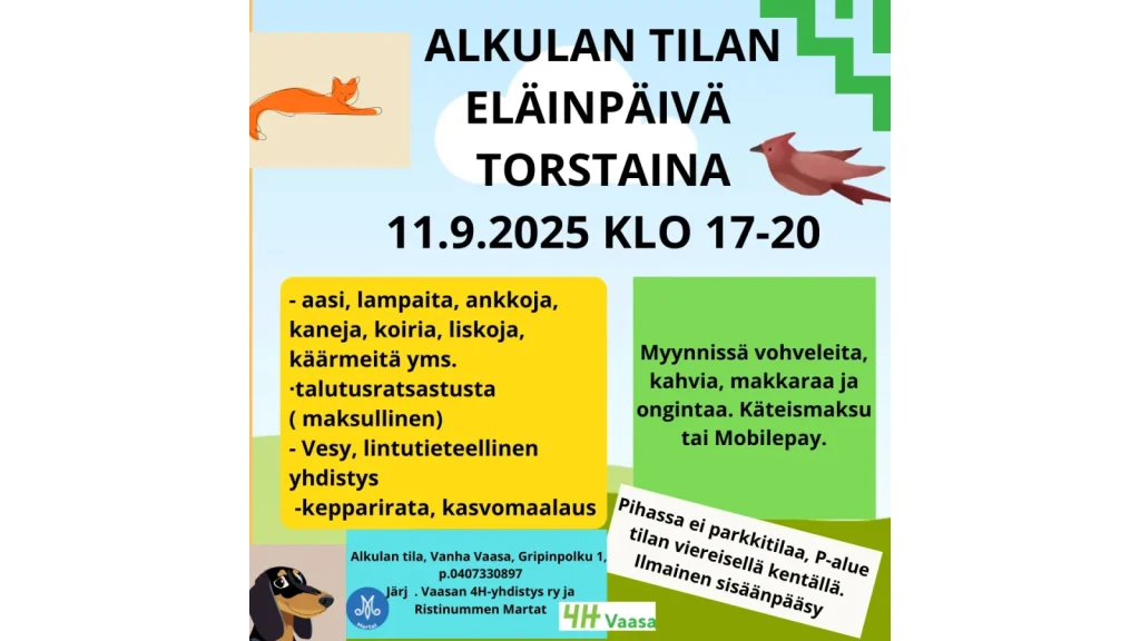 Eläinpäivä 11.9. klo 17-20 Alkulan tila, Vanha Vaasa Vaasan 4H-yhdistys ja Ristinummen Martat