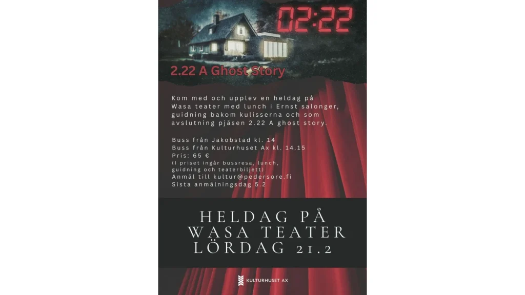 Vi startar från Jakobstad/Kulturhuset Ax på eftermiddagen och när vi anländer till teatern börjar vi med att äta lunchbuffé i Ernst salonger. Efter lunchen får vi en guidad tur bakom kulisserna och dagen avslutas med den prisbelönta thrillern 2.22 A Ghost story.