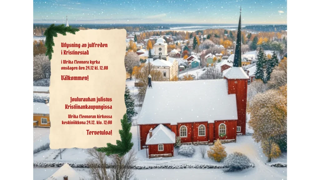Perinteinen Joulurauhan julistus järjestetään Ulrika Eleonora kirkossa 24.12.2025 klo 12. Ota mielellään led kybttilä mukaan kirkkoon. Pukeudu lämpimästi. Tervetuloa!