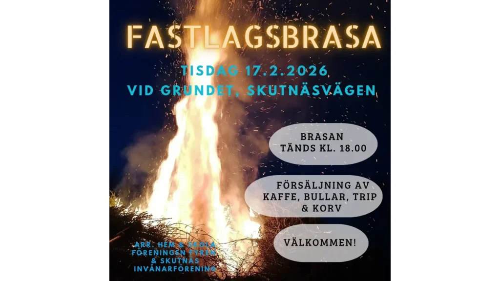 Skutnäsin Asukasyhdistys ja Hem & Skola föreningen Fyren järjestää Laskiaiskokon Grundetissa, Pietarsaaressa tiistaina 17.2.2026. Kokko sytytetään klo. 18. Myydään kahvia, pullaa, mehua ja grillimakkaraa!