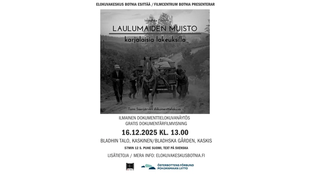 Elokuvakeskus Botnia järjestää ilmaisesityksen Etelä-Pohjanmaalaisen Tomi Saarijärven dokumentista Laulumaiden muisto – Karjalaisia Lakeuksilla 16.-18.12.2026. Vaasassa, Laihialla ja Kaskisissa.