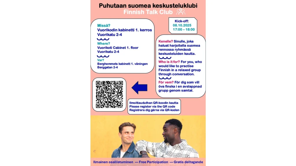 Puhutaan suomea keskusteluklubi on maksuton, viikoittainen tapaaminen niille, joilla on jo perustaidot suomen kielessä ja jotka haluavat harjoitella puhumista rennossa ilmapiirissä muiden kanssa. Jos et pääse mukaan joka viikko, se ei haittaa ollenkaan!