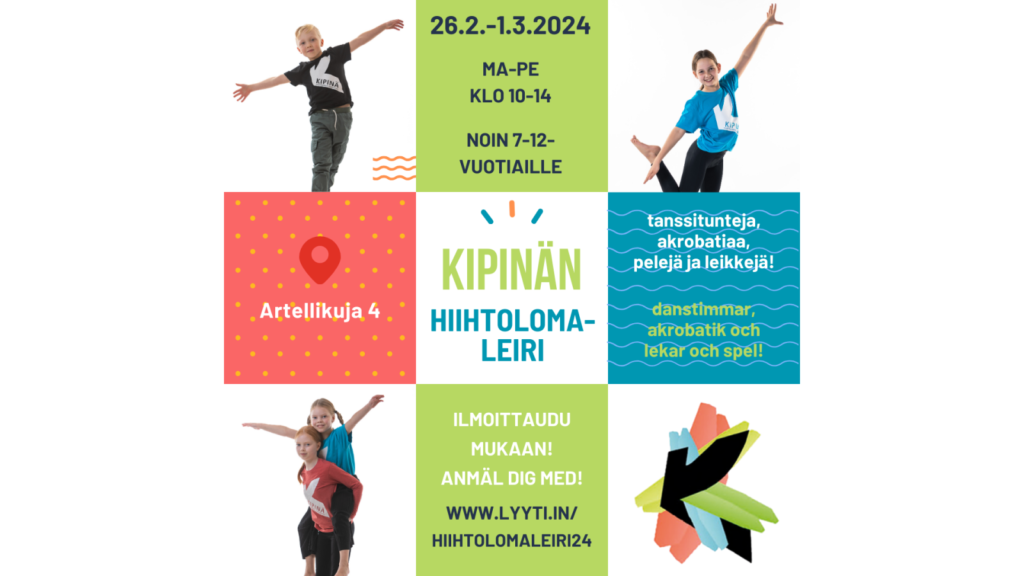 Järjestämme Kipinällä lasten tanssileirin 26.2.-1.3.2024! Viiden päivän ajan treenataan eri tanssilajeja, leikitään ja pidetään hauskaa yhdessä. Ohjelmassa on myös ulkoilua sään salliessa!