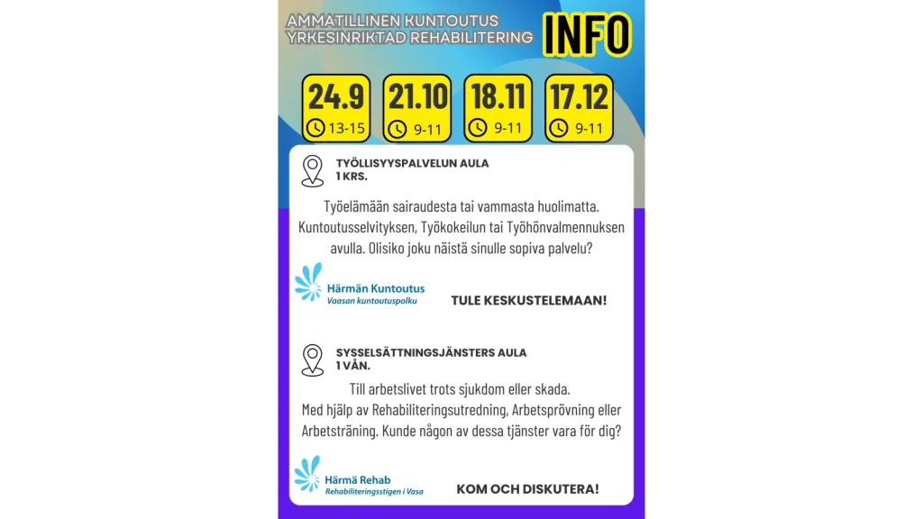 Mitä on ammatillinen kuntoutus? Voisiko kuntoutusselvitys, työkokeilu tai työhönvalmennus olla sinulle sopiva vaihtoehto? Olemme syksyn aikana kerran kuukaudessa työllisyyspalvelujen aulassa vastaamassa kysymyksiisi.