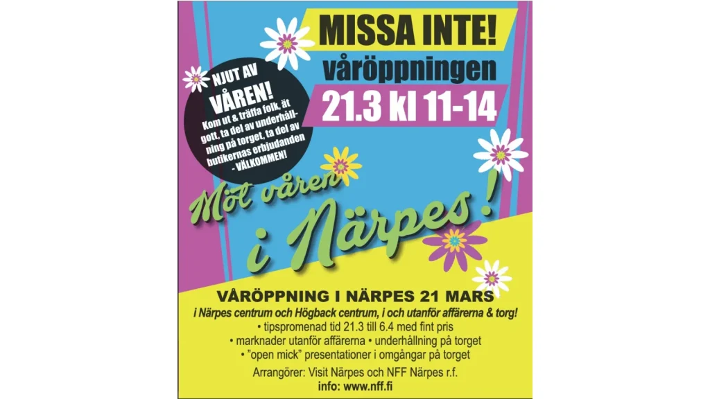 Välkommen att fira in våren med en härlig dag fylld av liv och rörelse i Närpes! Njut av god mat, ta del av fina vårerbjudanden i butikerna och strosa bland marknadsstånd längs Närpesvägen.På torget bjuds det på underhållning och skön stämning, och i affärerna kan du delta i en rolig tipspromenad. En dag full av smak, shopping och vårkänsla!