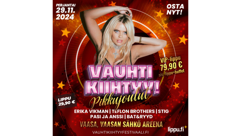 Talven suurin pikkujoulufestivaali Vauhti kiihtyy soi Vaasan Sähkö Areenalla perjantaina 29.11.2024. Esiintymässä nähdään Erika Vikman, Teflon Brothers, Stig, Pasi ja Anssi ja Bad & Ryyd! Lipunmyynti käy kuumana, Areenalla nähdään talven suurimmat juhlat!