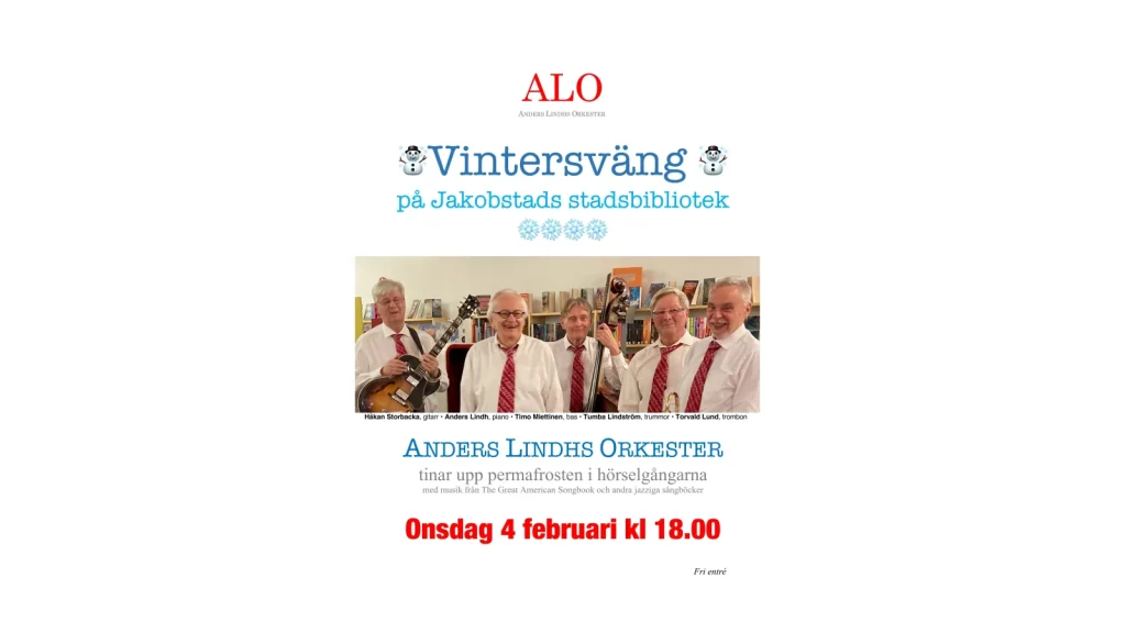 ONSDAGEN DEN 4 FEBRUARI KL 18.00 brakar 2026 års Vintersväng loss – den här gången på Jakobstads stadsbibliotek med fri entré. ALO har fått dispens från regeln att det ska vara tyst på ett bibliotek.