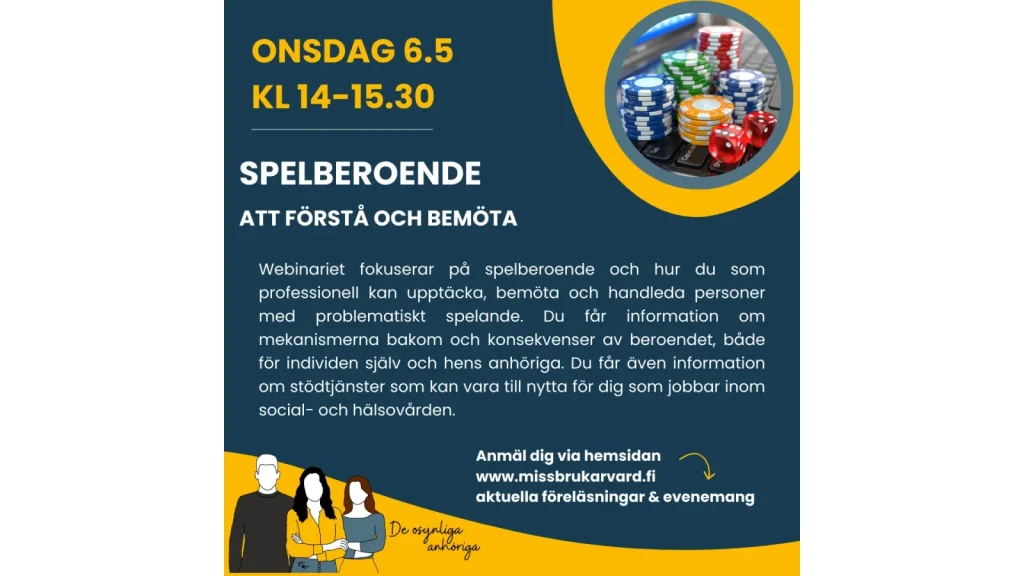 Webinariet fokuserar på spelberoende och hur du som professionell kan upptäcka, bemöta och handleda personer med problematiskt spelande. Du får information om mekanismerna bakom och konsekvenser av beroendet, både för individen själv och hens anhöriga. Du får även information om stödtjänster som kan vara till nytta för dig som jobbar inom social- och hälsovården.