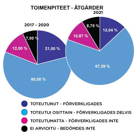 Toimenpiteiden osalta tilanne on erilainen. Vuodesta 2014 alkanut kehitys on johtanut siihen, että vuosittaisista toimenpiteistä toteutuu nykytilanteessa jo kaksi kolmasosaa. Osittain tämä selittyy myös sillä, että vuosina 2020-2021 oli voimassa pääosin samanlaiset toimenpiteet. Tämän johdosta viime valtuustokauden lopun ja vuoden 2021 toimenpiteiden toteumat ovat luonnollisesti hyvin samankaltaisia. Vuonna 2021 toimenpiteistä toteutui täysin tai osittain noin 80 prosenttia. Karkeasti ottaen noin 10 prosenttia ei toteutunut tai toimenpiteen toteutumista ei kyetty arvioimaan. Vuodelle 2021 asetettiin 46 toimintaa ohjaavaa toimenpidettä.