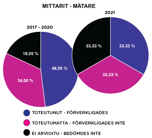 Vaasan kaupungin keskeisten mittareiden tulokset kuvaavat hyvin myös kaikkien strategiassa määriteltyjen mittareiden toteumaa vuodelta 2021. Mittareiden osoittama kokonaistulos vuodelta on jakautunut hyvin tasaisesti. Karkeasti ottaen tilanne oli vastaava myös strategian eri osa-alueiden ja niiden tavoitteiden osalta. Noin 33 prosenttia mittareista toteutui, noin 33 prosenttia jäi toteutumatta ja noin kolmeakymmentä kolmea prosenttia ei kyetty arvioimaan. Vuodelle 2021 asetettiin 27 toiminnan toteutumista mittavaa mittaria.