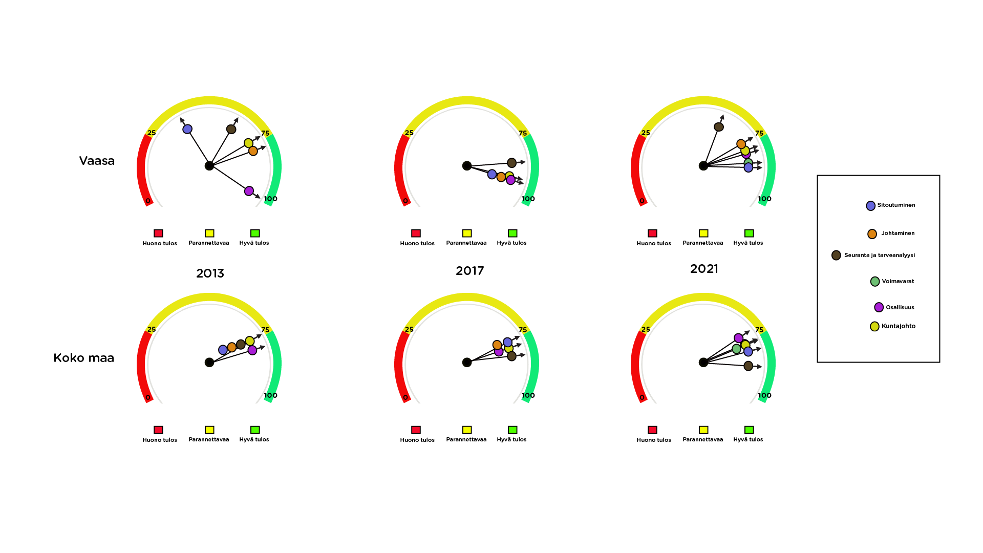 Viimeisten valtuustokausien aikana, vuodesta 2013 alkaen, ovat Vaasan kaupungin TEA-mittarin kuntajohtoa käsittelevät arvot aluksi nousseet ja sen jälkeen laskeneet. Terveyden ja hyvinvoinnin laitoksen aineistossa ovat Vaasan kaupungin vuoden 2017 tulokset selkeästi parhaimmat. Vuonna 2017 Vaasan kuntajohtamisen kokonaistulos ylsi yhdeksäänkymmeneen pisteeseen kun korkein tulos on sata pistettä. Strategian uudistamisen aikoihin, vuonna 2013, Vaasan kaupungin tulos oli seitsemänkymmentäyksi pistettä ja vuoden 2021 tilanteessa ollaan jälleen lähes samalla tasolla seitsemänkymmentäseitsemässä pisteessä.